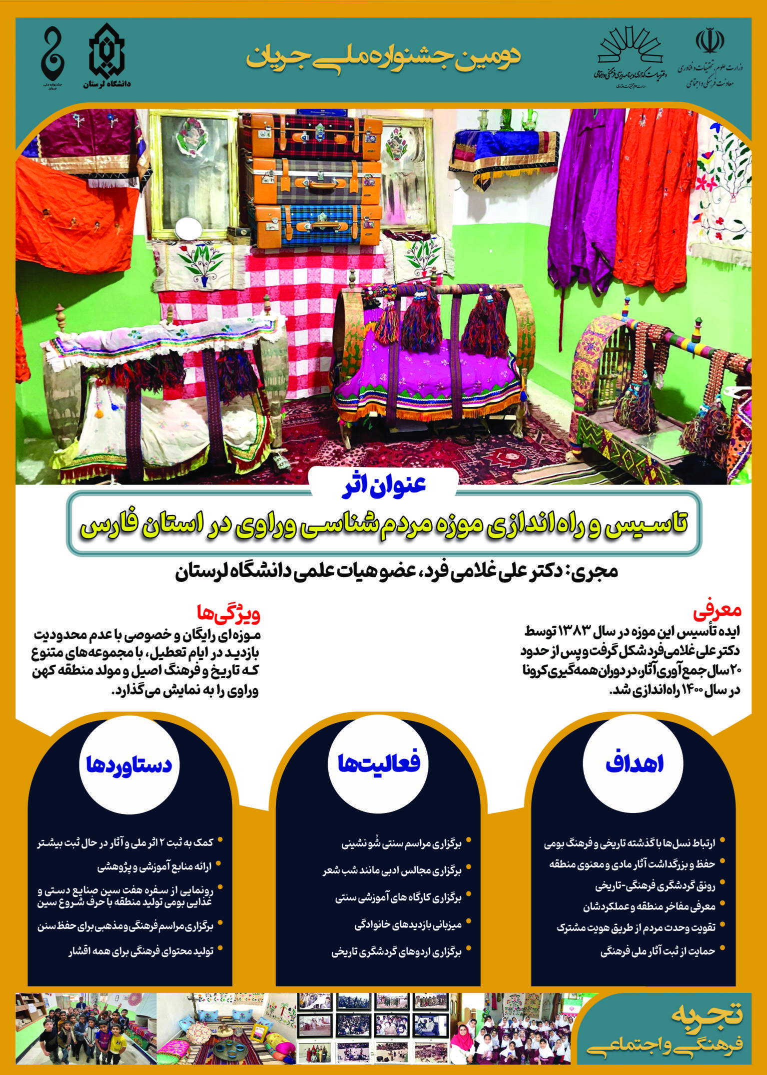 دکتر غلامی‌فرد در بخش «تجربه‌های فرهنگی و اجتماعی» با اثر تأسیس و راه‌اندازی موزه مردم‌شناسی وراوی در استان فارس شرکت کرده بود؛ اثری که به‌عنوان نمونه‌ای از کنشگری فرهنگی و اجتماعی یک عضو هیئت علمی دانشگاه انتخاب شد.